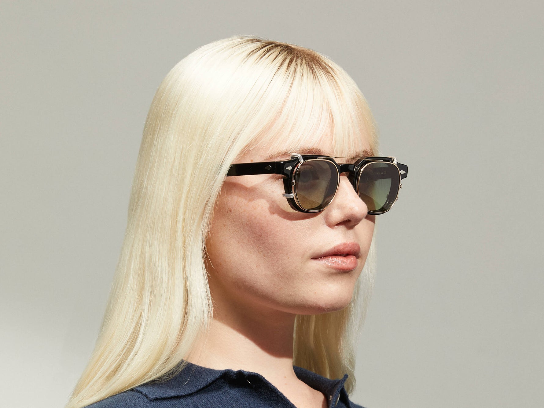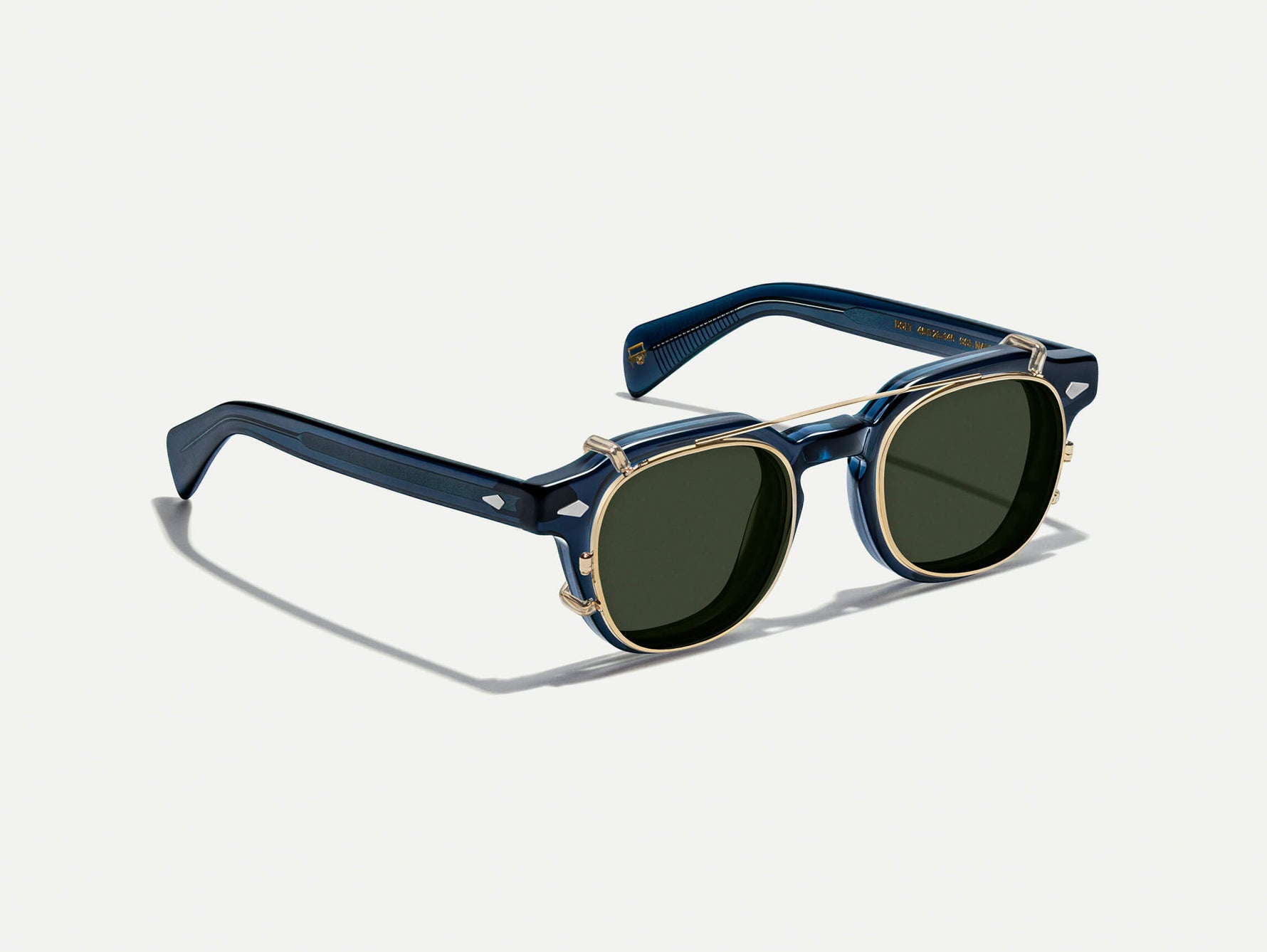Model is wearing The DOLT CLIP in Gold in size 46 with Denim Blue Tinted Lenses
