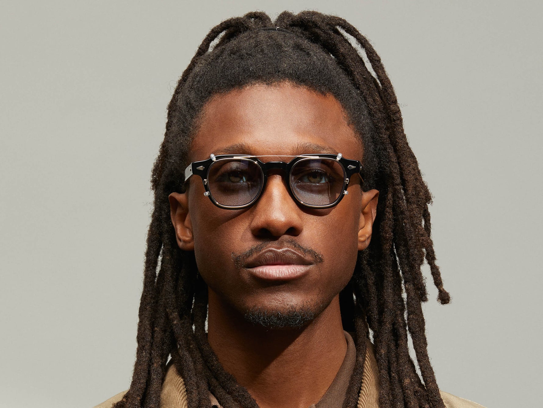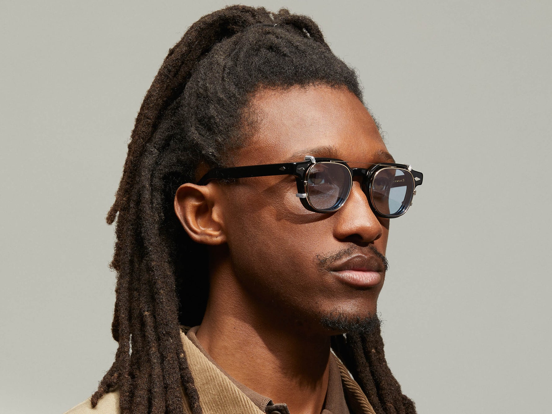 Model is wearing The DOLT CLIP in Gold in size 46 with G-15 Tinted Lenses