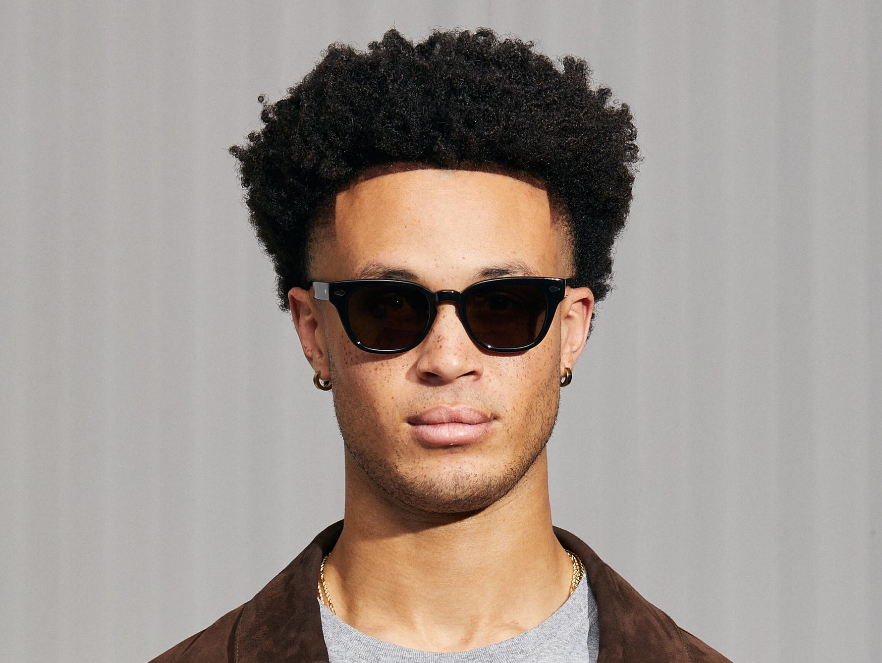 Model is wearing The HAZEN SUN in Dark Grey in size 50 with American Grey Fade Tinted Lenses